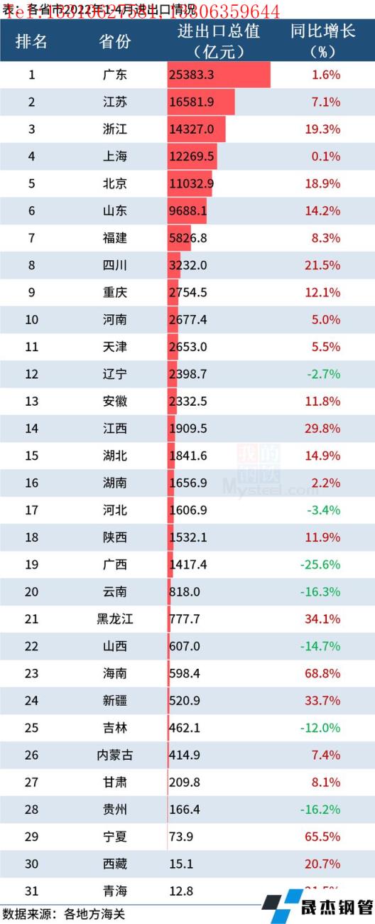 从同比增速来看,24个省市实现同比正增长,海南以68.8%的增速位居全国第一;7个省市实现负增长,广西以-25.6%的增速位居末位。进出口总值突破万亿元的5个省市中,浙江、北京的增速超出全国水平,同比分别增长19.3%、18.9%。具体如下: