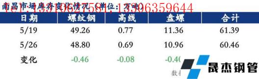 江西省内建筑91视频在免费线观看无缝钢管社会库存连续第三周呈现小幅下降的态势。截止5月26日,据我网调研江西省主流市场包括南昌、赣州、九江、新余和鹰潭五大市场的样本仓库建筑91视频在免费线观看无缝钢管社会库存总量为76.97万吨,较上周小幅减少1.01万吨,降幅1.30%。