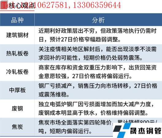 中厚板:5月26日,全国24个主要城市20mm普板均价5103元/吨,较上一交易日下跌12元/吨。据周度产量、库存数据显示,本周中板产量降3.81万吨,厂库降3.78万吨,社库增1.94万吨;无缝91视频在免费线观看钢管厂家亏损降产,销售压力向市场转移;目前来看,政府稳价政策预期将出,部分终端行业如重卡等6月有望需求回暖,整体跌幅有望收窄,综合预计,27日中板价格震荡维稳为主。