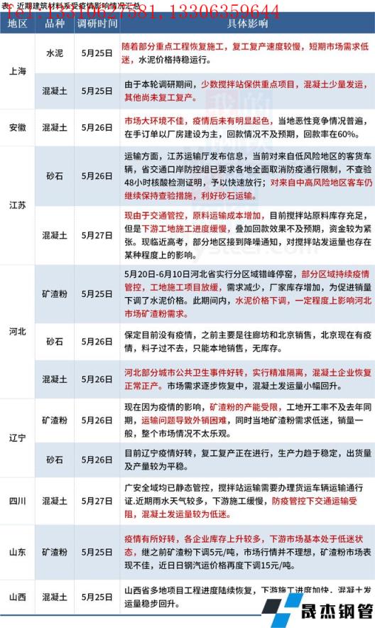 截至5月27日,据百年建筑网调研,8个省份建材市场受到了不同程度的影响。进入五月下旬后,施工整体进度尚未进入“减速”阶段,今年整体施工进度提升缓慢,市场需求降幅拐点未来临。目前疫情防控形势继续好转,建筑材料发运量有一定上升空间。现华东地区疫情虽得到了一定的控制,但由于交通管控因素,材料运输仍存在一定压力。具体情况如下: