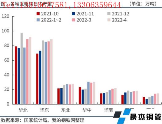 2022年4月份,华北、华东、东北、华中、华南、西南、西北等地区粗钢日均产量91.9万吨、88.8万吨、28.0万吨、30.5万吨、22.0万吨、18.3万吨和14.8万吨,分别较3月份增加3.0万吨、2.9万吨、0.9万吨、1.0万吨、0.7万吨、0.6万吨和0.5万吨。