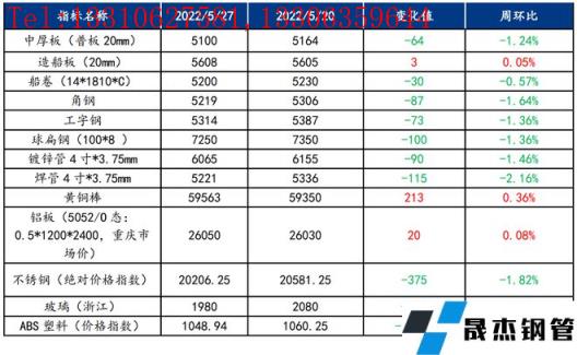 截止2022年5月27日,各原材料当日即时价格以及价格周环比情况如下: