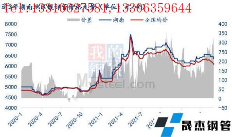 2021年湖南地区镀锌管价格最高点在5月14日报7490元/吨,创下历史新高,最低点为1月4日地区报5400元/吨,高低跨度达2090元/吨。今年价格的主导因素主要来自宏观政策,一季度紧供给预期促使镀锌管价格大幅上涨,二季度强预期弱现实的博弈下,市场价格震荡走弱,5月湖南镀锌管价格出现200元的跌幅,仅比年初上涨100元/吨。另外,湖南地区已比全国均价高出近300元/吨,处于今年来高位,这侧面说明当前长沙区域镀锌管利润情况尚可。