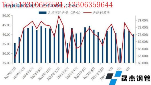 调研数据显示:据监测的26家镀锡板生产企业中,共计49条产线,2022年5月份产能利用率71.02%,月环比下降2.66%,同比下降5.08%;5月镀锡板实际产量40.14万吨,月环比减少2万吨,同比减少3.32万吨;另外,对国内重点镀铬生产企业调研数据显示,5月份镀铬板产量共计7.32万吨。