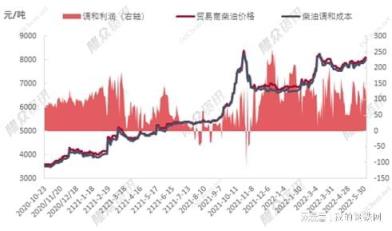 反观柴油,依据华东江里贸易商 柴油价格及其原料价格走势进行监测,2022年5月华东成品柴油原料价格同比出现1.5-2.5%的涨幅。在5月夏收带动下,成品柴油价格同步上涨,致使柴油成本利润均出现提升,但进入6月份,随着南方进入梅雨季节,需求逐步回落,柴油理论利润或相应收窄。见上图3。