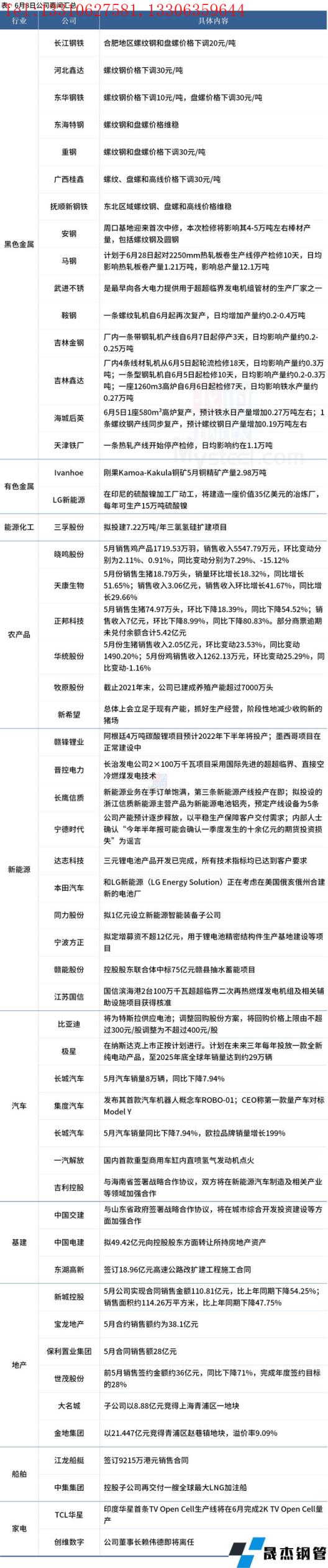安钢周口基地迎来首次中修,本次检修将影响其4-5万吨左右棒材产量,包括螺纹钢及圆钢;马钢计划于6月28日起对2250mm热轧板卷生产线停产检修10天,日均影响热轧板卷产量1.21万吨,影响总产量12.1万吨;赣锋锂业阿根廷4万吨碳酸锂项目预计2022年下半年将投产;赣能股份控股股东联合体中标75亿元赣县抽水蓄能项目;比亚迪将为特斯拉供应电池。