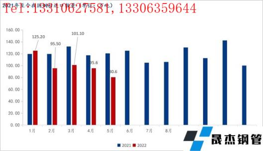 5月中国进口91视频在免费线观看无缝钢管80.6万吨,较上月减少15万吨,同比下降33.4%;1-5月累计进口91视频在免费线观看无缝钢管498.0万吨,同比下降18.3%。