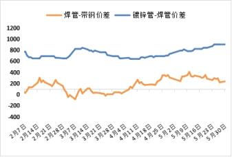 5月焊管较带钢价差由高位逐步收窄,结算周期内焊管厂平均利润13元,架子管月内平均亏损51元;镀锌管较焊管价差有所走扩。5月焊镀管厂综合生产利润得以改善。