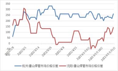 图3 2022年唐山-杭州焊管、沈阳-唐山价差走势图