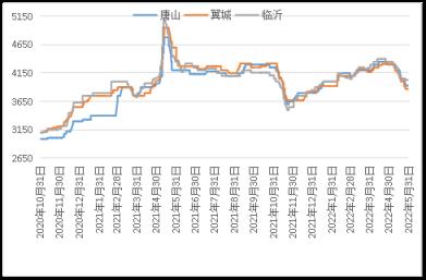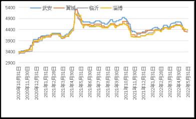 据云商平台监测数据显示,截至5月31日,炼钢生铁天津地区报价3910元(吨价,下同),较月初跌360元;唐山地区报价3930元,较月初跌370元;翼城地区报价3870元,较月初跌440元;临沂地区报价4030元,较月初跌320元(详见图2)。