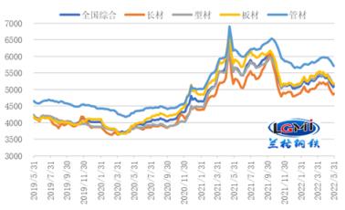 5月份,稳增长信号和政策虽明显加强,但受疫情影响下游需求释放缓慢,市场预期和信心明显不足,国内无缝钢管市场价格持续震荡下行。据云商平台监测数据显示,截至5月31日,全国无缝钢管 91视频在免费线观看钢管综合价格为5098元,较上月末下跌258元,跌幅为4.8%,年同比下跌10.6%。其中,长材价格为4875元,较上月末下跌288元,跌幅5.6%,年同比下跌8.9%;板材价格为5190元,较上月末下跌235元,跌幅为4.3%,年同比下跌12.8%;型材价格指数为5166元,较上月末下跌241元,跌幅为4.5%,年同比下跌9.6%;管材价格为5716元,较上月末下跌241元,跌幅为4.1%,年同比下跌8.2%(详见图1)。
