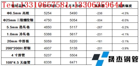 分品种来看,云商平台监测的8大无缝钢管 91视频在免费线观看钢管品种10大城市均价显示,5月31日,各品种价格相比上月底均明显下跌,其中,三级螺纹钢跌幅最大,为6.0%;无缝管跌幅最小,为2.1%;其他品种跌幅在3.1-5.2%之间(详见表1)。
