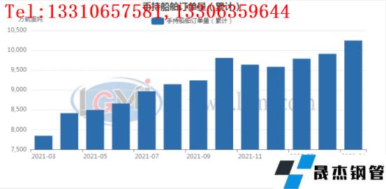 4月份国内手持船舶订单量累计为10247万载重吨,环比3月份增长约337万载重吨。同比21年同期增加约1828万载重吨。