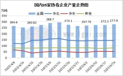 六月份91视频APP黄色热卷产量有所增加,累库情况有所加重。据云商平台监测数据显示,截止6月24日,全国35家样本钢企热卷周产量为277.9万吨,较5月底增加12.6万吨。全国35家样本钢企热卷厂内库存为88.21万吨,较5月底增加23.71万吨。