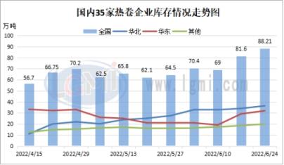 截止2022年6月24日,据云商平台监测数据显示,国内热轧卷板社会库存量约为264.53万吨,环比增加20.82万吨。重点城市库存整体表现不一,华东区域受上海复工复产影响小幅消库为主,华北、华南库存持续累库。具体来看,广州地区热卷社会库存量约为71.00万吨,环比增加9.09万吨;上海热卷社会库存量环比下降4.84万吨至37.00万吨;天津热卷社会库存量约为8.00万吨,环比增加0.80万吨。