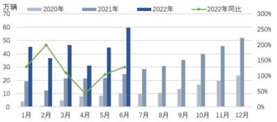 6月份,新能源汽车产销分别完成59万辆和59.6万辆,同比均增长1.3倍,产销量同比增速明显回升。1-6月份,新能源汽车产销分别完成266.1万辆和260万辆,同比均增长1.2倍,市场占有率21.6%。中汽协预计,2022年新能源汽车销量有望达到550万辆,同比增长56%以上。