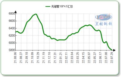 据云商平台监测数据显示:截至7月29日,国内十大主导城市108*4.5无缝管市场均价5805元,较上月同期跌205元。